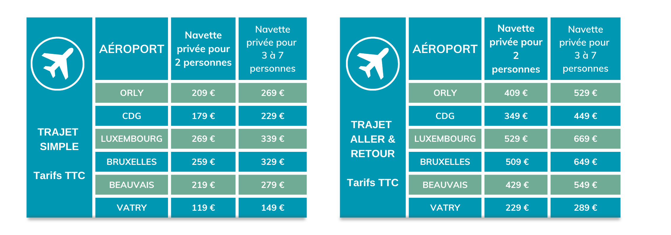 Les tarifs proposés sont indiqués par navette et par aéroport. Ils sont valables pour une navette privative (de 2 à 7 personnes). En cas de transport de nuit (entre 21h et 06h00), jour férié ou dimanche, une majoration sur les tarifs sera appliquée. Nous consulter.