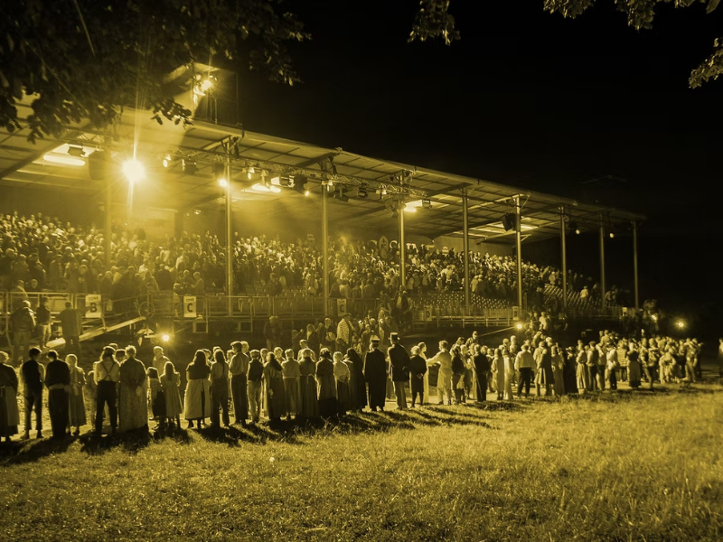 Ce qui distingue La Cassine en Ardenne, c’est son dispositif scénique unique en Europe : une tribune mobile et couverte qui se déplace sur 300 mètres, suivant le parcours des protagonistes et offrant une vue spectaculaire sur la plus grande scène du Grand Est. Les spectateurs suivent l’action de près, se laissant transporter d’un point à un autre, de la place du Couvent des Cordeliers aux ruines du château.